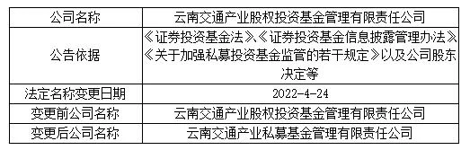 關(guān)于云南交通產(chǎn)業(yè)股權(quán)投資基金管理有限責(zé)任公司法定名稱變更的公告