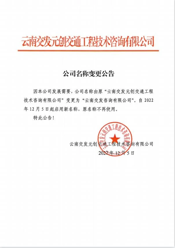 云南交發(fā)元創(chuàng)交通工程技術咨詢有限公司名稱變更公告