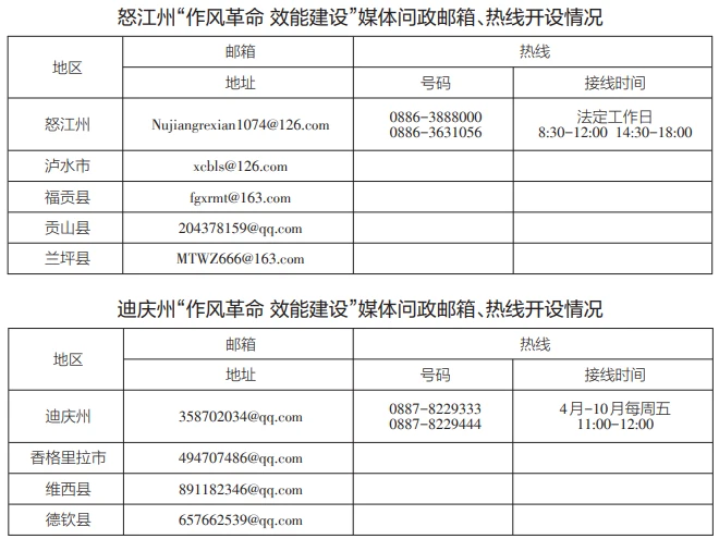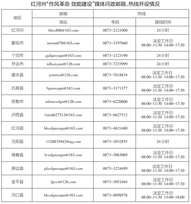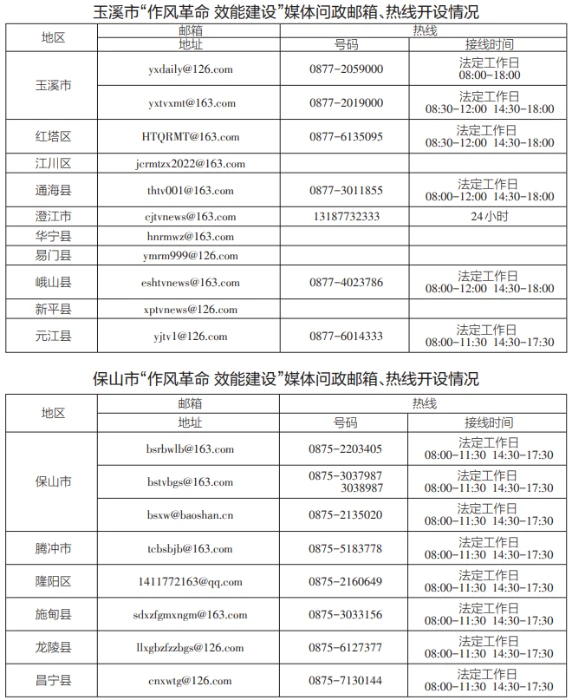 為深入貫徹落實《云南省推進作風革命加強機關效能建設的若干規(guī)定(試行)》,即日起,我省將全面開展“作風革命 效能建設”媒體問政工作。全省各級媒體將面向社會公眾開設“作風革命 效能建設”問政專區(qū),采用電子郵箱、廣播電視專題節(jié)目、熱線電話等多種形式暢通群眾、基層、企業(yè)訴求渠道,廣泛收集各類意見建議,開展輿論監(jiān)督。歡迎廣大群眾、各類企業(yè)就全省各地區(qū)各部門在轉(zhuǎn)變作風、提升效能,服務群眾、服務基層、服務企業(yè)過程中存在的不良現(xiàn)象、典型問題,積極提供相關新聞報道線索。各級媒體將及時把意見建議和問題線索反饋至有關部門,持續(xù)跟蹤問效,推進問題解決。